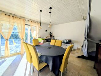 Villa Salernes - Dans un quartier résidentiel, belle maison contemporaine comprenant de plain-pied : une entrée avec WC invités, un spacieux salon / séjour avec baie vitrée donnant sur terrasse couverte, une cuisine ouverte aménagée, une chambre parentale avec porte-fenêtre donnant sur terrasse couverte, un dressing et une salle d'eau, une deuxième chambre ; à l'étage : 3 chambres dont 2 avec placards, une salle de bains avec baignoire balnéo et douche, une pièce à aménager. Sous-sol, piscine, local technique, sur un terrain de 2 500 m² entièrement clos. Exposition Sud, aucun vis-à-vis !